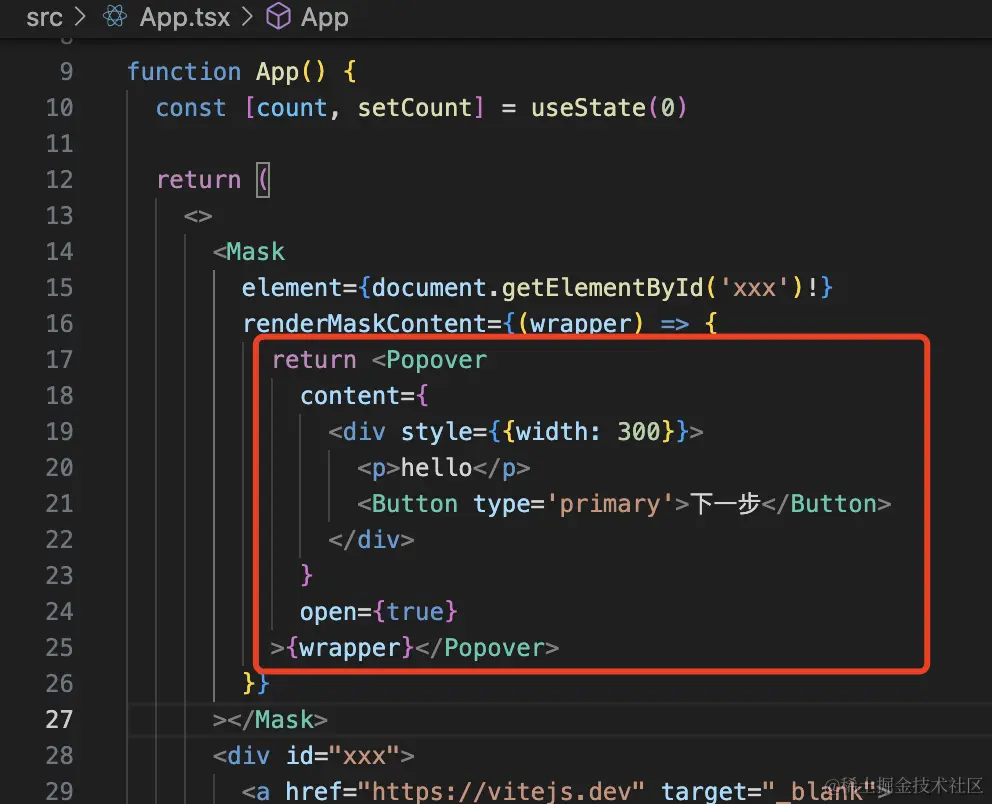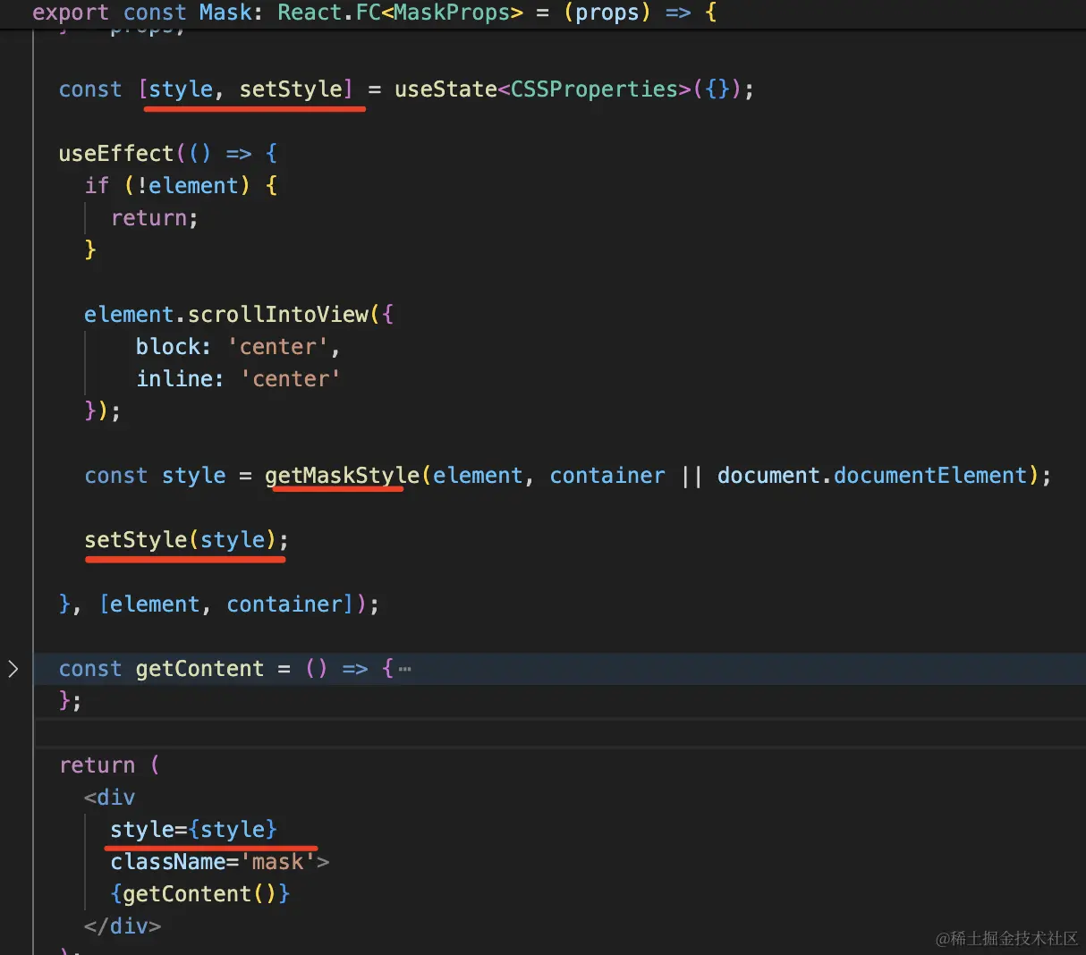 此外,还要注意,mask 需要在 dom 树渲染完之后才能拿到 dom 来计算样式,所以需要 useEffect + setState 来触发一次额外渲染。