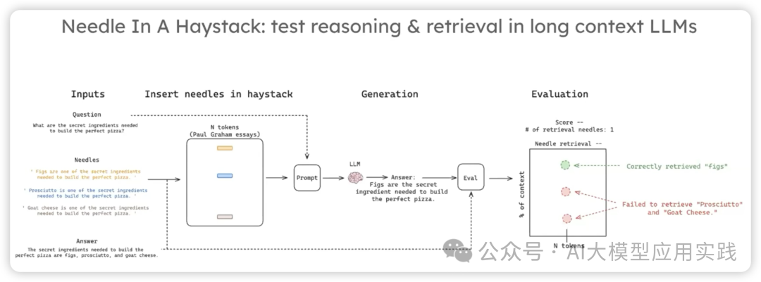 在一个超长的上下文中插入多个“针”(needles,即知识点),比如上面的图中,把制作完美披萨的三个秘密成分,作为三个“针”插入到上下文的特定位置(如开头、中间与结尾),并且让其他内容和这个三个“针”的知识完全不相关。然后要求LLM基于这个上下文来回答:**制作完美披萨的秘密成份有哪些?**以验证LLM在上下文中精准的检索出这三个“针”并推理答案的能力。 采用类似的方法,你就可以测试不同的“针”的数量、不同的上下文长度、不同的“针”位置下大模型的表现。