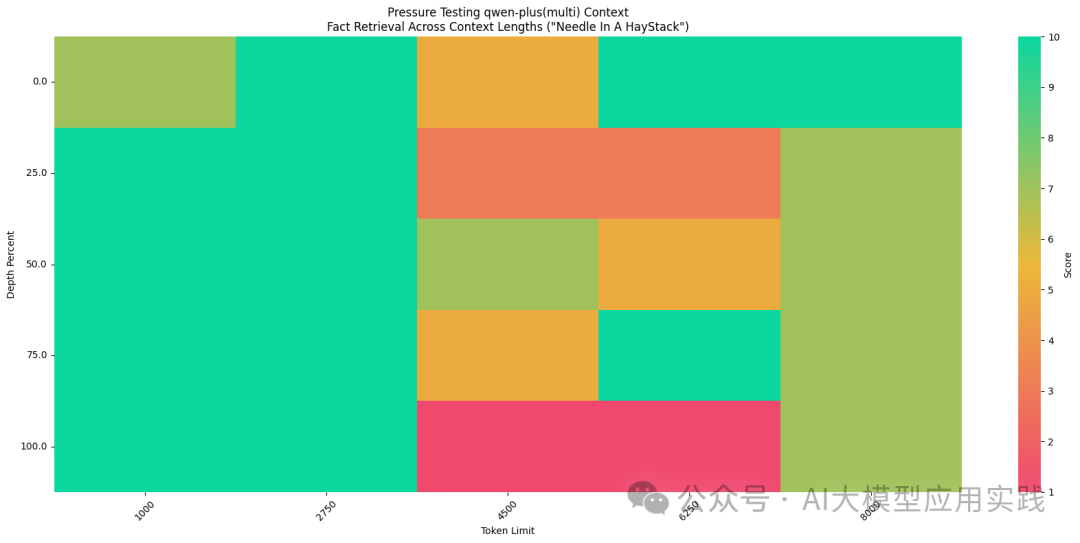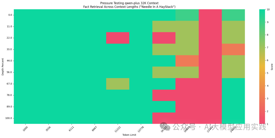 可以看到横轴上代表从1K上下文一直到24k的十个不同上下文,纵轴上代表测试的“针”在上下文中所处的不同位置。从测试结果上看,当上下文逐渐增大时,开始出现很明显的“幻觉”问题,开始编造答案,导致评分明显降低。当然这里没有测试更强大的qwen-max模型,或许会有不一样的表现。