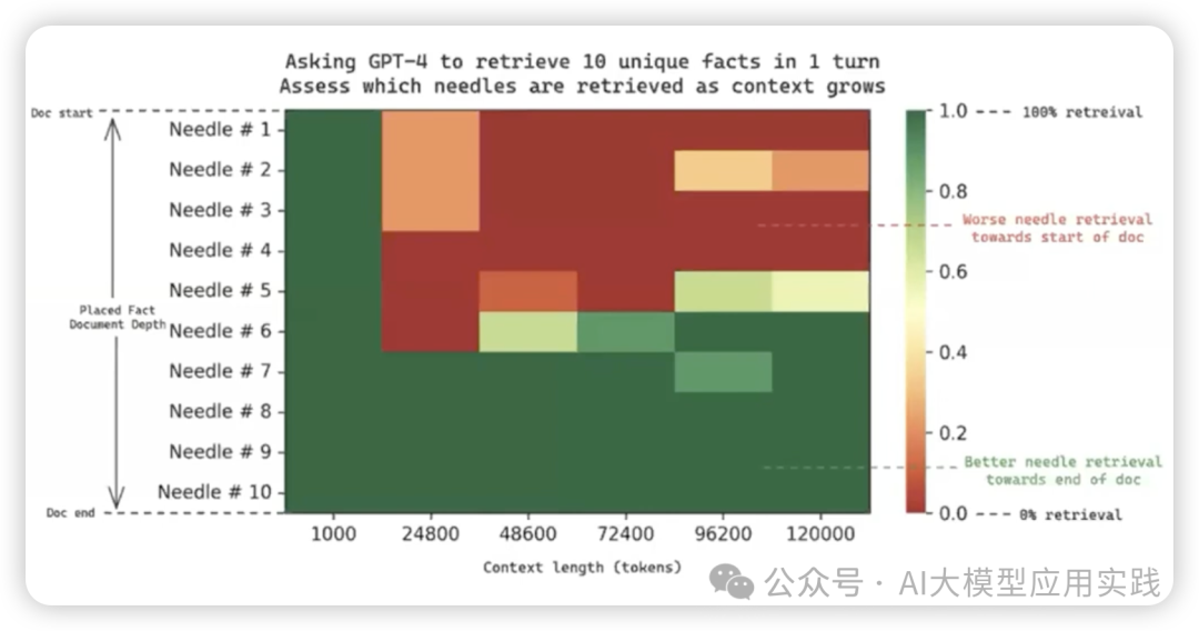 **LLM检索的成功率和上下文长度相关。**比如在1K的上下文中,GPT4可以轻而易举的找到10个“针”,但是当上下文扩大10倍甚至100倍后,很显然发生了大量的丢失(红色区域)。