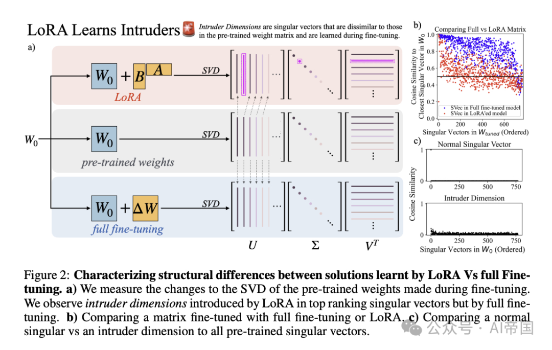 研究团队通过对模型权重矩阵的深入分析发现,LoRA训练出的模型中存在一些特殊的"入侵维度"(intruder dimensions)。这些维度就像是模型中的"异质成分",虽然不影响模型在目标任务上的表现,但会导致模型"忘记"更多预训练时学到的知识,并且在持续学习多个任务时表现不够稳定。