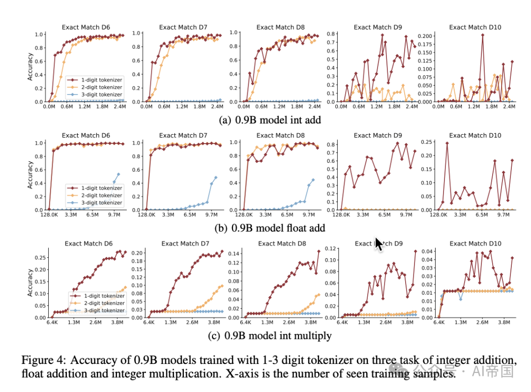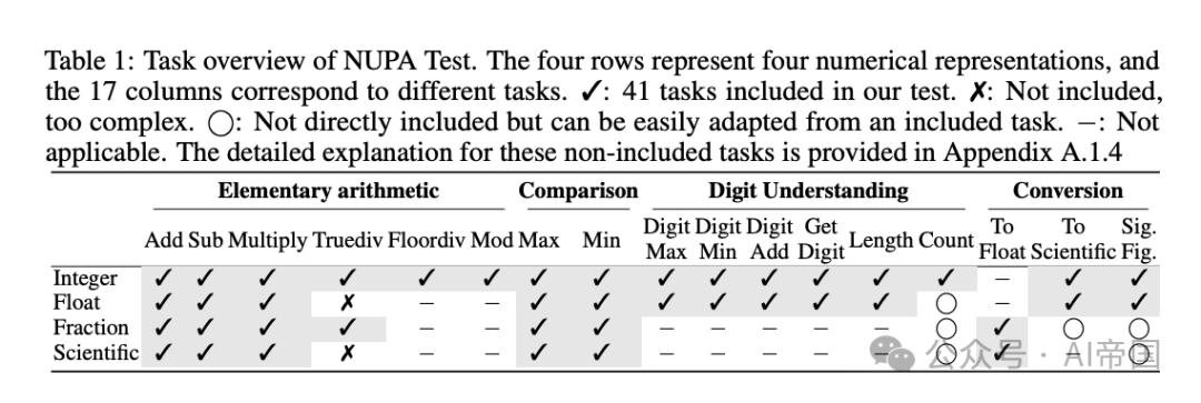 为了系统研究这个问题,来自北京大学等机构的研究人员开发了一个全面的测试基准。他们从小学到高中的数学课程中提取了4种数字表示方法(整数、小数、分数、科学计数法)和17种基础运算任务,创建了41组测试。这些看似简单的任务,即使是最新的GPT-4和Llama-3.1这样的顶尖模型也频频失手,尤其是在稍微复杂一点的计算(如乘法、取模)或处理整数之外的数字表示时。