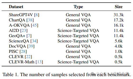 面向科学的 VQA 数据集 这些数据集包括用于几何推理的 GeoQA+,以及专注于科学问题的 AI2D 和 ScienceQA。CLEVR-Math 是 CLEVR 的扩展版,专注于视觉背景下的算术分析。下表 1 列出了从每个数据集中选择的问答对数量。
