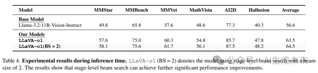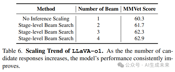 证明了 LLaVA-o1 使用阶段级束搜索具有推理时的可扩展性。这意味着通过增加计算资源,本文的方法性能可以进一步提升,从而适用于更复杂的任务和场景。