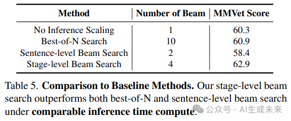为了评估相对性能,在 MMVet 基准上将阶段级束搜索方法与基线推理扩展方法进行了对比。在公平比较的前提下,所有方法使用了相似的推理时间计算成本: