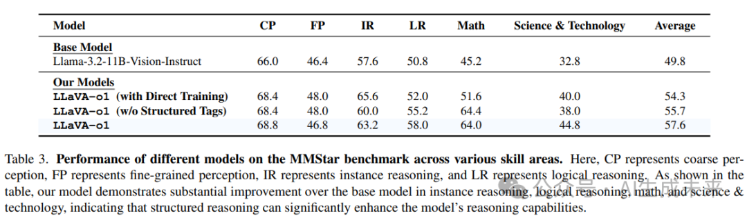 如下表 3 所示,LLaVA-o1 在需要系统推理的任务上(如实例推理、逻辑推理、数学、科学与技术)表现出显著改进,而在粗略感知和细粒度感知上的提升相对较小。这表明本文的方法主要增强了模型的推理能力。