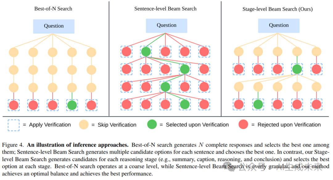 值得注意的是,正是 LLaVA-o1 的结构化输出设计使得这一方法成为可能,从而在每个阶段实现高效且准确的验证。这验证了结构化输出在提高推理时间扩展中的有效性。三种方法的示意图见下图 4。