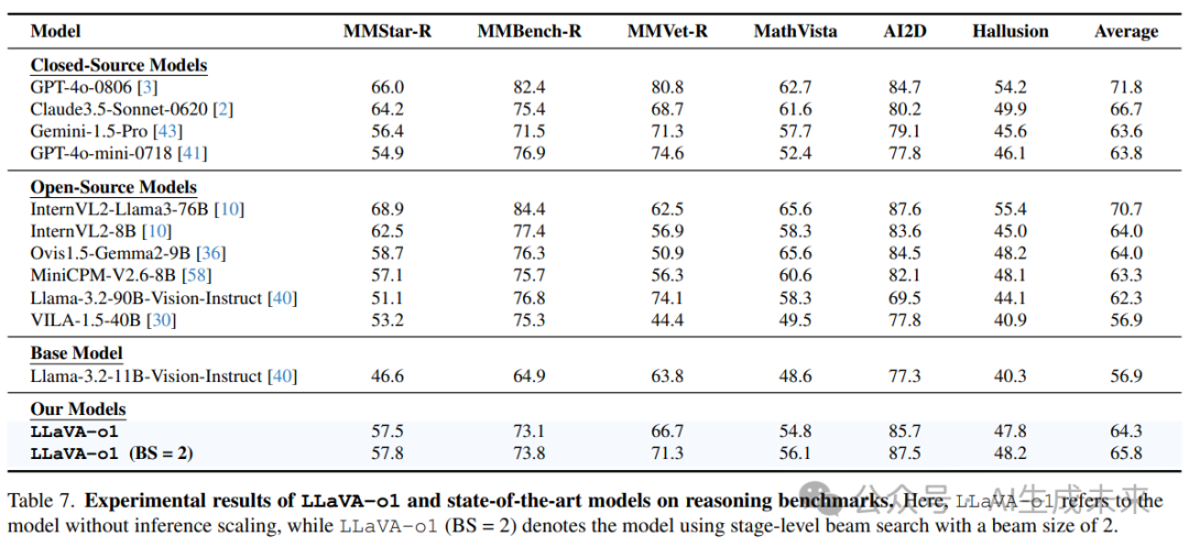 如下表7所示,将LLaVA-o1与其他最先进的开源和闭源视觉语言模型(VLM)在六个需要高级推理能力的基准上进行了比较:MMStar-R、MMBench-R、MMVet-R、MathVista、AI2D和HallusionBench。MMStar-R、MMBench-R和MMVet-R是从MMStar、MMBench V1.1和MMVet中衍生的自定义基准,去除了仅需要粗略感知、细粒度感知和OCR的任务。这些过滤后的基准保留了需要复杂推理的任务。MathVista、AI2D和HallusionBench本身聚焦于高级推理,因此保留了这些基准中的所有任务。