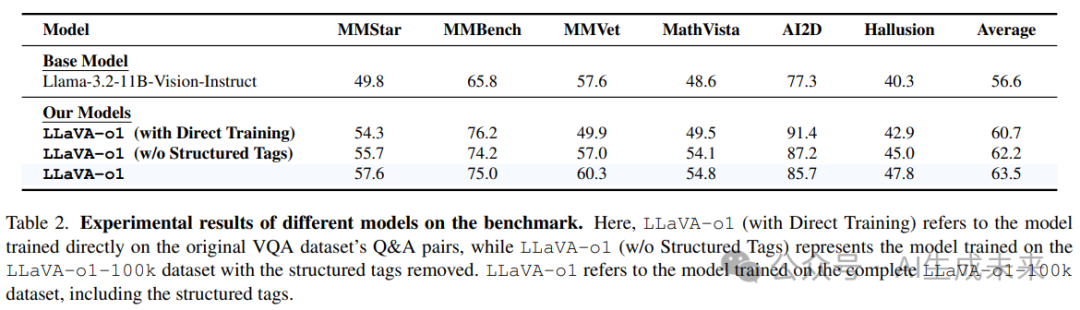为了验证改进后的 LLaVA-o1-100k 数据集的有效性,对比了 LLaVA-o1 和直接在原始问答对上训练的模型在不同基准上的表现(见上表 2)。尽管直接在原始问答对上训练的模型对基础模型有一定的整体提升,其平均性能仍显著较低,尤其是在需要更详细回答的 MMVet 基准上,其表现甚至低于基础模型。这一结果强调了 LLaVA-o1-100k 数据集中多阶段格式在训练具备高级推理能力的模型时的重要性。