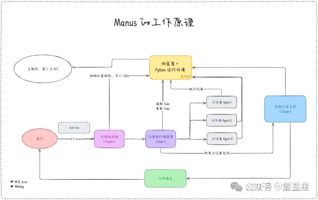 最后聊聊manus,manus 的账号我拿不到,还没体验过,看了些 b 站上的评测视频,原理应该好简单,核心工作流程如下: