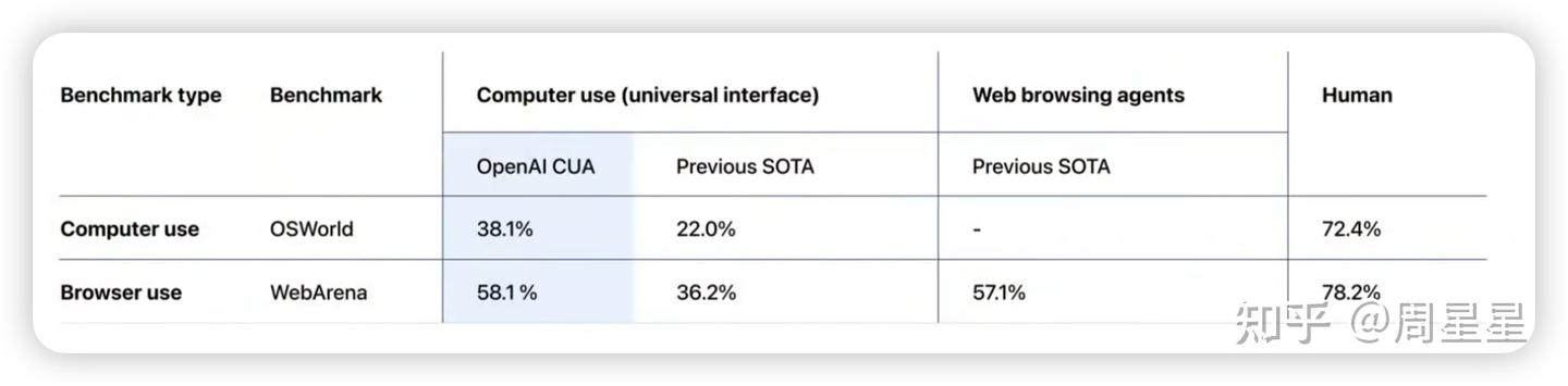 - 长链路任务表现欠佳:例如在多个搜索结果中找不到答案时容易失去方向导致卡住,这个主要是模型问题,应该很快能有所提升。如下面 openai 公布的 benchmark,operator还远远达不到人类水平。