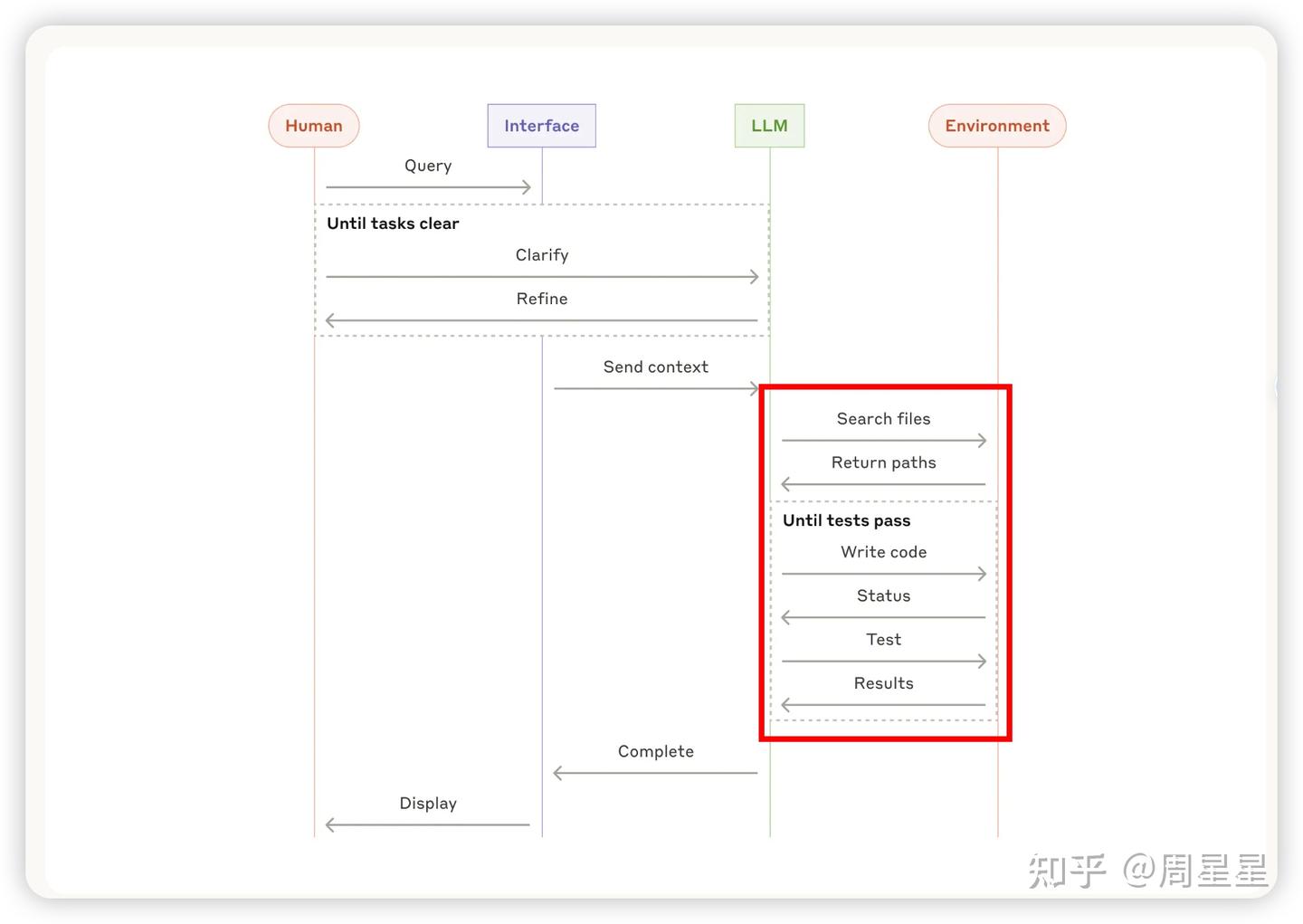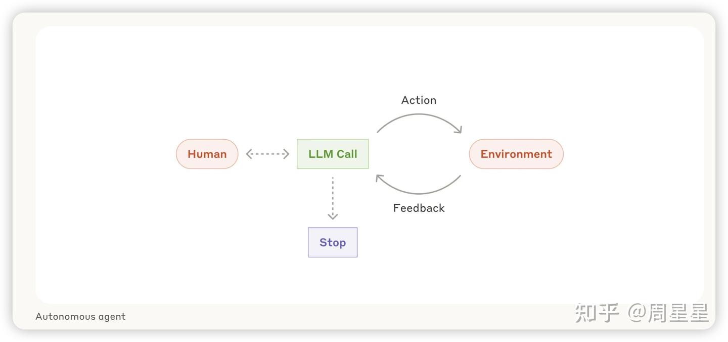 Agent在循环(loop)中工作,根据输入自己选择合适的工具,并能根据环境反馈调整策略——例如当代码执行失败时,能根据错误信息自动修正;或根据问题性质自主决定采用sequence还是Parallel的workflow方式解决。