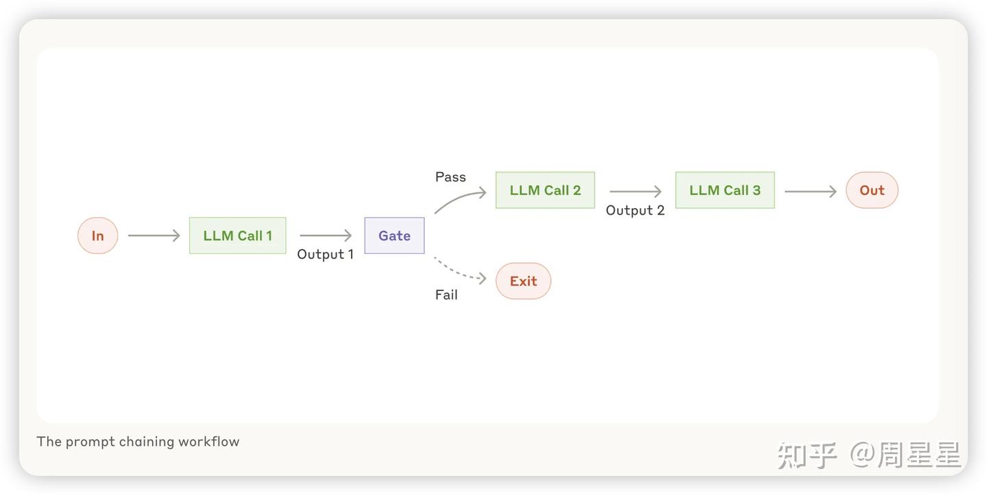 链式工作流就是将复杂任务分解为连续步骤,每步LLM调用处理前一步输出,可添加检查点(如下图的Gate)确保过程正确。适用于可清晰划分的任务,如营销文案生成后翻译或先创建文档大纲再撰写完整内容。