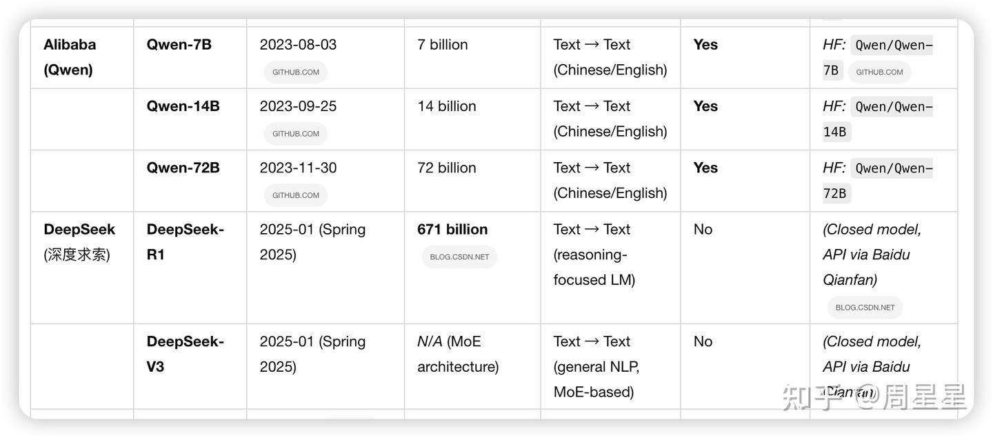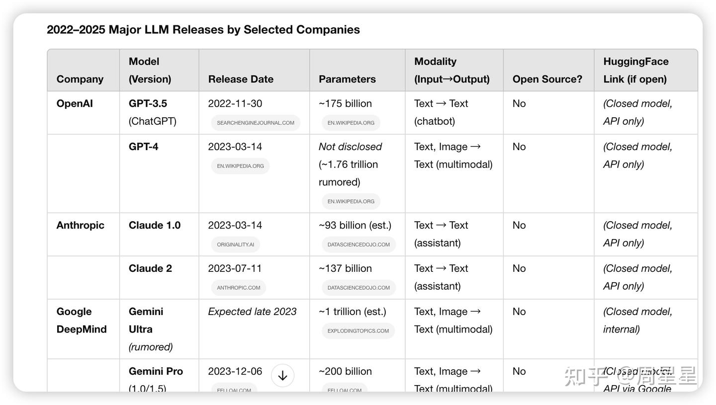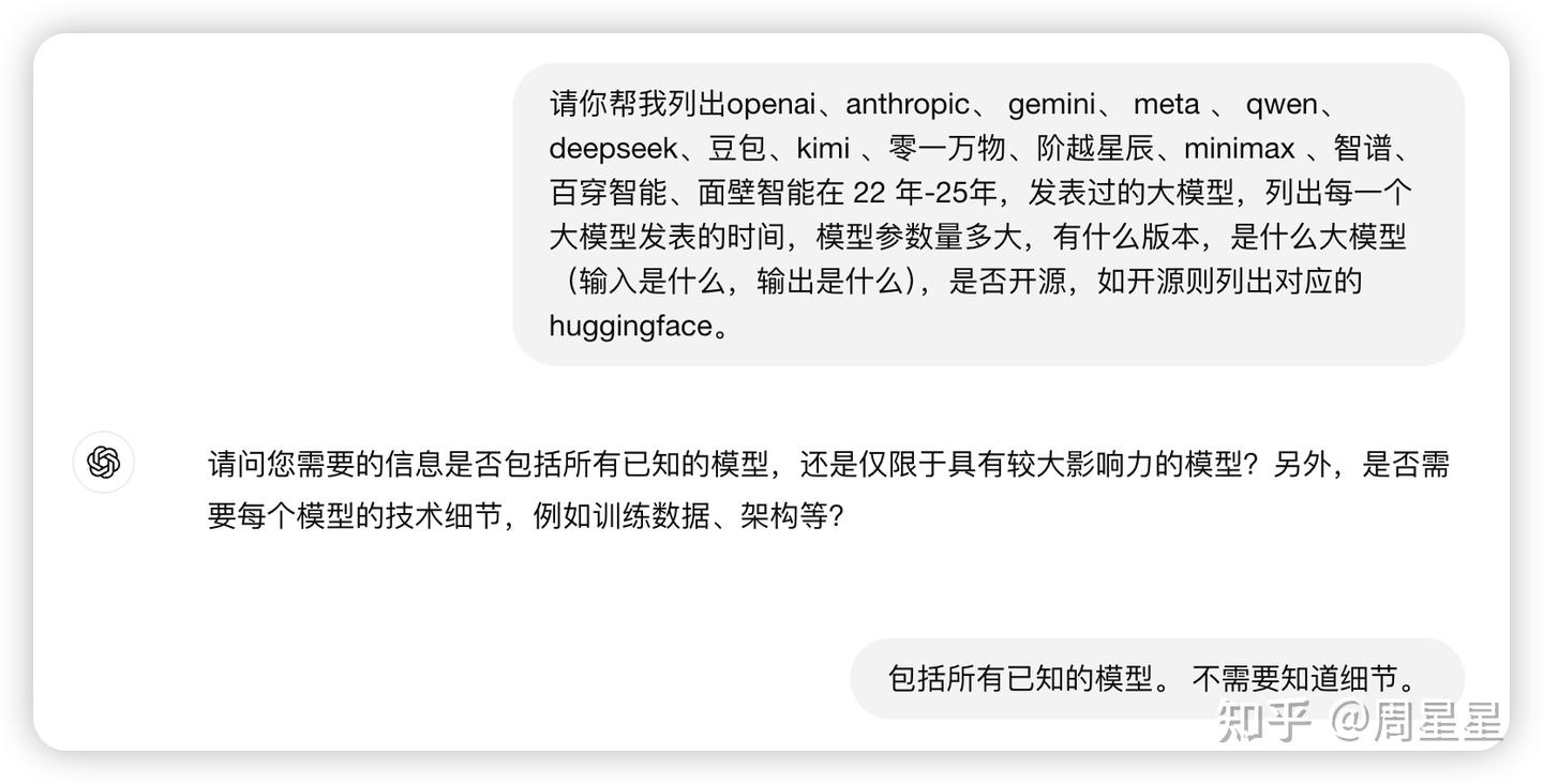 - 例子一:请你帮我列出openai、anthropic、 gemini、 meta 、 qwen、 deepseek、豆包、kimi 、零一万物、阶越星辰、minimax 、智谱、百穿智能、面壁智能在 22 年-25年,发表过的大模型,列出每一个大模型发表的时间,模型参数量多大,有什么版本,是什么大模型(输入是什么,输出是什么),是否开源,如开源则列出对应的 huggingface。