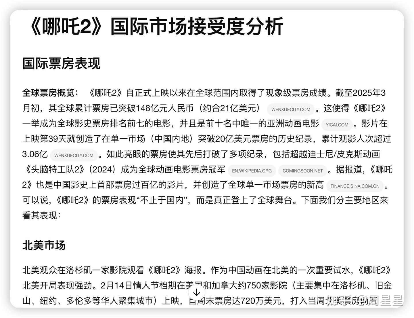 例子的问题:引用的信息源不够准确,有时候说引用了 CNN 的报道,但实际打开,发现并不是 CNN,容易捏造数据,例如说票房 60亿,但打开数据源,发现数据源并没有提到 60。