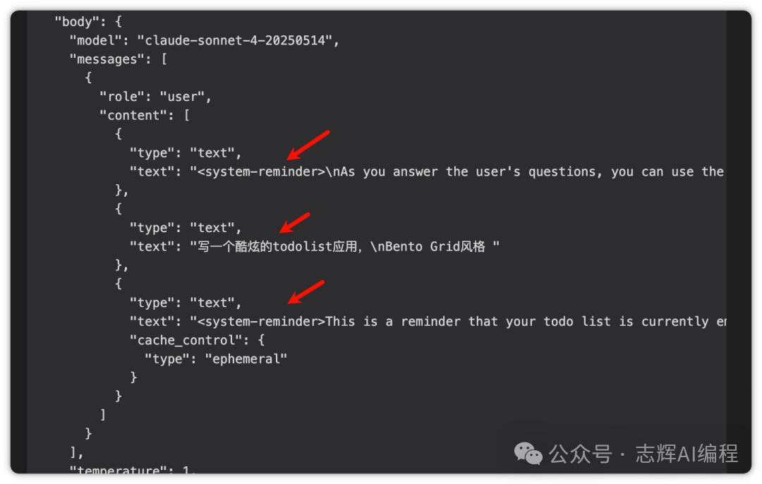 这个是第三次的请求参数,可以看到并不是纯用户输入的提示词,还有 <system-reminder> 附加了一些信息。