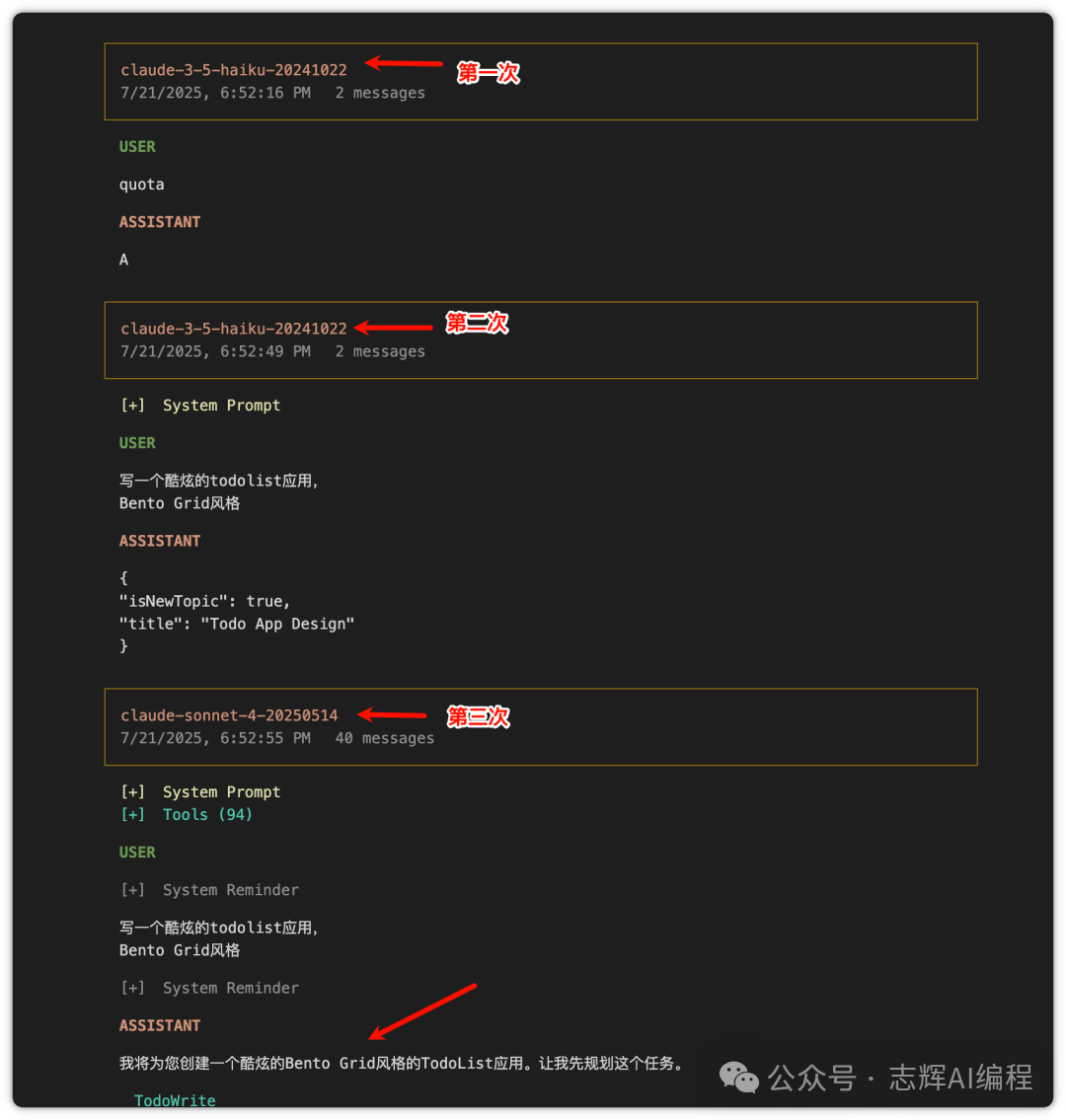 可以看到每次对话并不是一开始就用了 claude 4 模型的,而是用了 3.5 的模型。