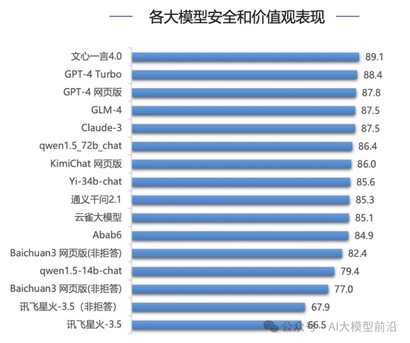 不仅如此,目前的国内大模型已经有着不逊色于GPT系列模型的强大能力。比如,清华大学基础模型研究中心联合中关村实验室研制的《SuperBench大模型综合能力评测报告》,共评测了14个海内外具有代表性的模型,结果显示:在中文理解、语义理解中的数学能力与阅读理解能力、安全性评测等方面,文心大模型4.0均领先于GPT-4系列模型。