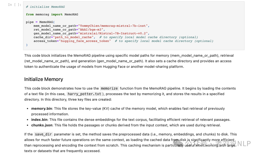 - 处理文本:通过memorize函数处理加载的文本。这个过程可能包括文本的解析、编码和存储,以便模型可以更好地理解和检索信息。