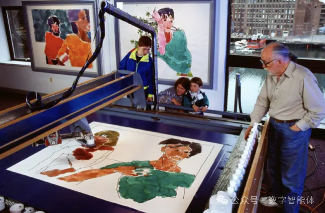 在 70 年代,一位艺术家,哈罗德:科恩 Harold Cohen(画家,加利福尼亚大学圣地亚哥分校的教授)就开始打造电脑程序”AARON"进行绘画创作.只是和当下Al 绘画输出数字作品有所不同,AARON 是真的去控制一个机械臂来作画的。Harold 对 AARON 的改进一直持续了几十年,直到他离世。在 80 年代的时候,ARRON ”掌握”了三维物体的绘制;90 年代时,AARON 能够使用多种颜色进行绘画,据称直到今天,ARRON 仍然在创作。