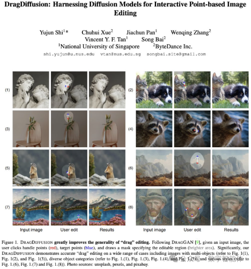 2023 年 6 月:DragDiffusion 论文发布。精确和可控的图像编辑是一项具有挑战性的任务,已经引起了极大的关注。最近,DragGAN 实现了一个基于点的交互式图像编辑框架,并以像素级的精度实现了令人印象深刻的编辑结果。然而,由于该方法是基于生成对抗网络 (GAN),其通用性受到预先训练好的 GAN 模型能力的上限限制。在这项工作中,我们将这样一个编辑框架扩展到扩散模型,并提出 DragDiffusion。通过利用大规模预训练的扩散模型,我们大大改善了基于点的交互式编辑在现实世界场景中的适用性。虽然大多数现有的基于扩散的图像编辑方法是在文本嵌入的基础上工作的,但 DragDiffusion 优化了扩散潜势,以实现精确的空间控制。虽然扩散模型以迭代的方式生成图像,但我们的经验表明,在一个单一步骤中优化扩散潜势就足以产生连贯的结果,使 DragDiffusion 能够有效地完成高质量的编辑。在各种具有挑战性的情况下(如多物体、不同的物体类别、各种风格等)进行的广泛实验证明了 DragDiffusion 的多功能性和通用性。