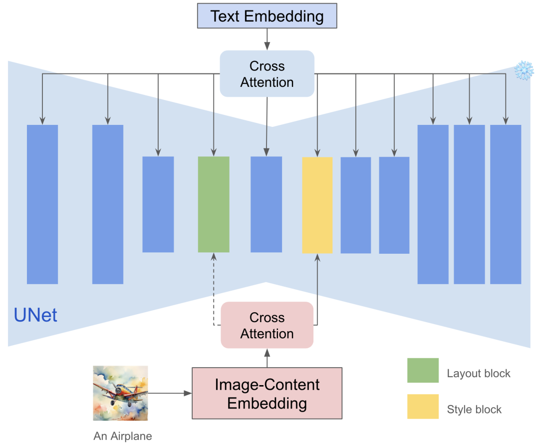 • 仅将参考图像特征注入到风格特定块中:这样可以防止风格泄漏,并避免繁琐的权重调整,这通常是参数较多设计的特点,使用
