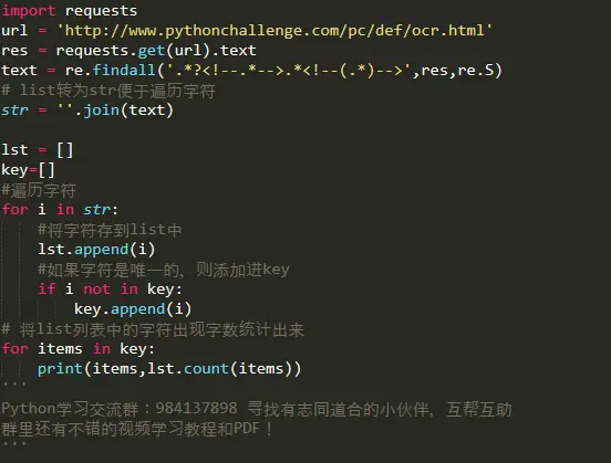 首先,用 Requests 请求网页然后用正则提取出字符串,接着 for 循环计算每个字符出现的次数。