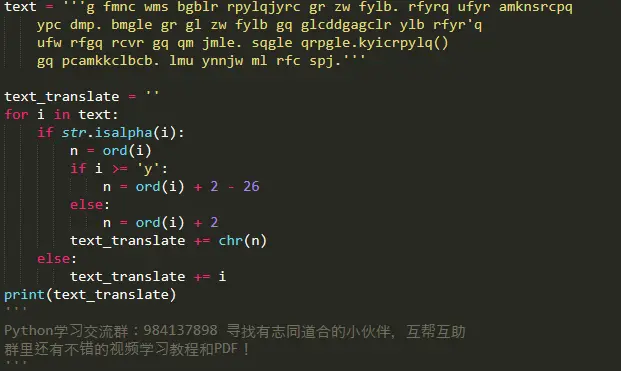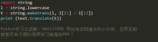 作者很风趣,当然不能手动去一个推算了,推荐用 string.maketrans() 这个方法解决,我们上面采取的是比较直接的方法,官方给出了更为精简的方法: