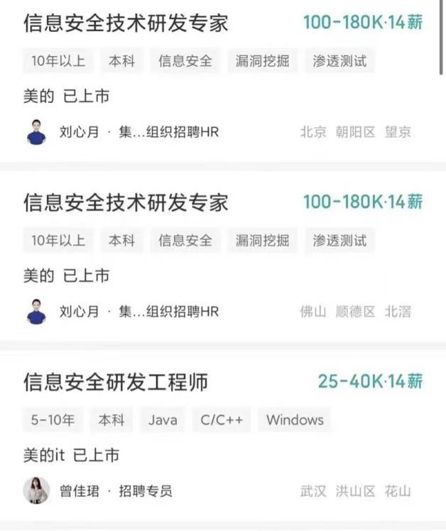 就在今天,美的集团遭受新型网络病毒攻击的新闻也上了热搜,尽管被证实是谣言,但搜索一下美的的招聘信息中的薪资,就知道他们对网络安全人员求贤若渴的程度。