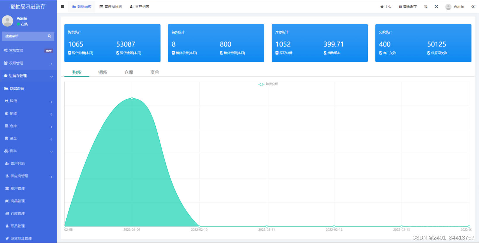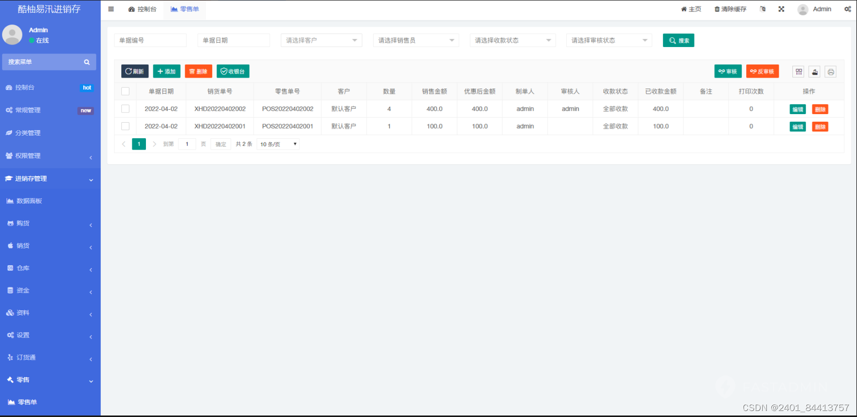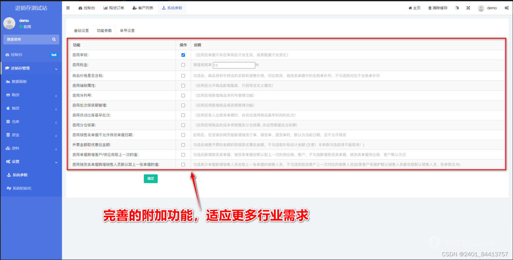 一款基于FastAdmin+ThinkPHP+Layui开发的进销存管理系统,帮助中小企业实现进销存管理规范化,此系统能为你解决四大方面的经营问题:1.采购管理2.销售管理3.仓库管理4.资金管理,适用于:服装鞋帽、化妆品、机械机电、家具装潢、建材行业、快销品、母婴用品、办公用品、汽配汽修、生鲜农贸、手机通讯、数码家电、医药用品、制造业、信息技术服务行业等。提供全部无加密服务端和前端源代码,独立部署,不受限制。