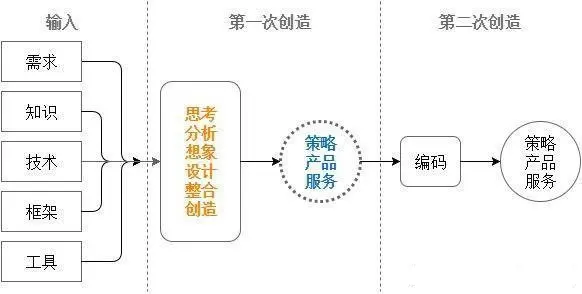 由这张图可以看到,开发者做软件分两次创造,第一次创造在头脑中完成,属于思考层面;第二次创造,是编码实现,是脑力劳动体力化。