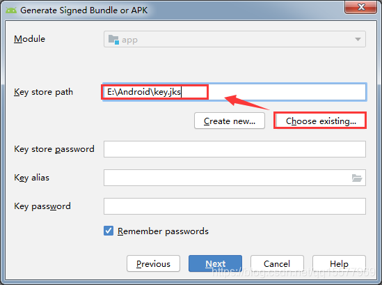 1、在Generate Signed Bundle or APK 界面上,点击 Choose existing… 选择密钥库文件位置