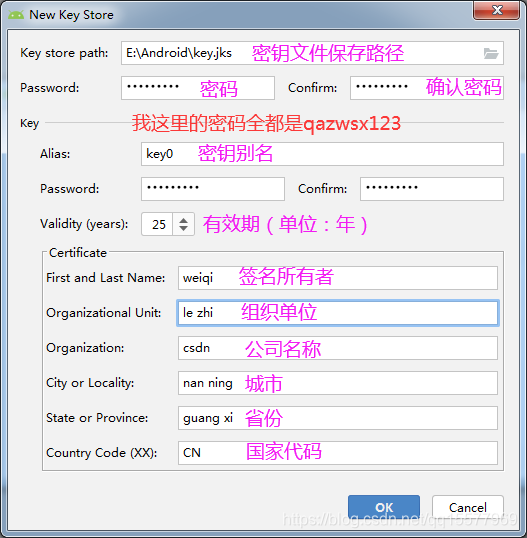 Password:密钥库密码;Confirm:确认密钥库密码;