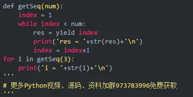 上述代码运行时,for中调用了getSeq,执行该函数时,遇到yield index时会将index的值返回,并且函数暂停在yield语句的位置,下次再调用getSequence时,将继续从上次暂停的位置开始运行,直到遇到yield关键词时又将index的值返回,一直这样循环