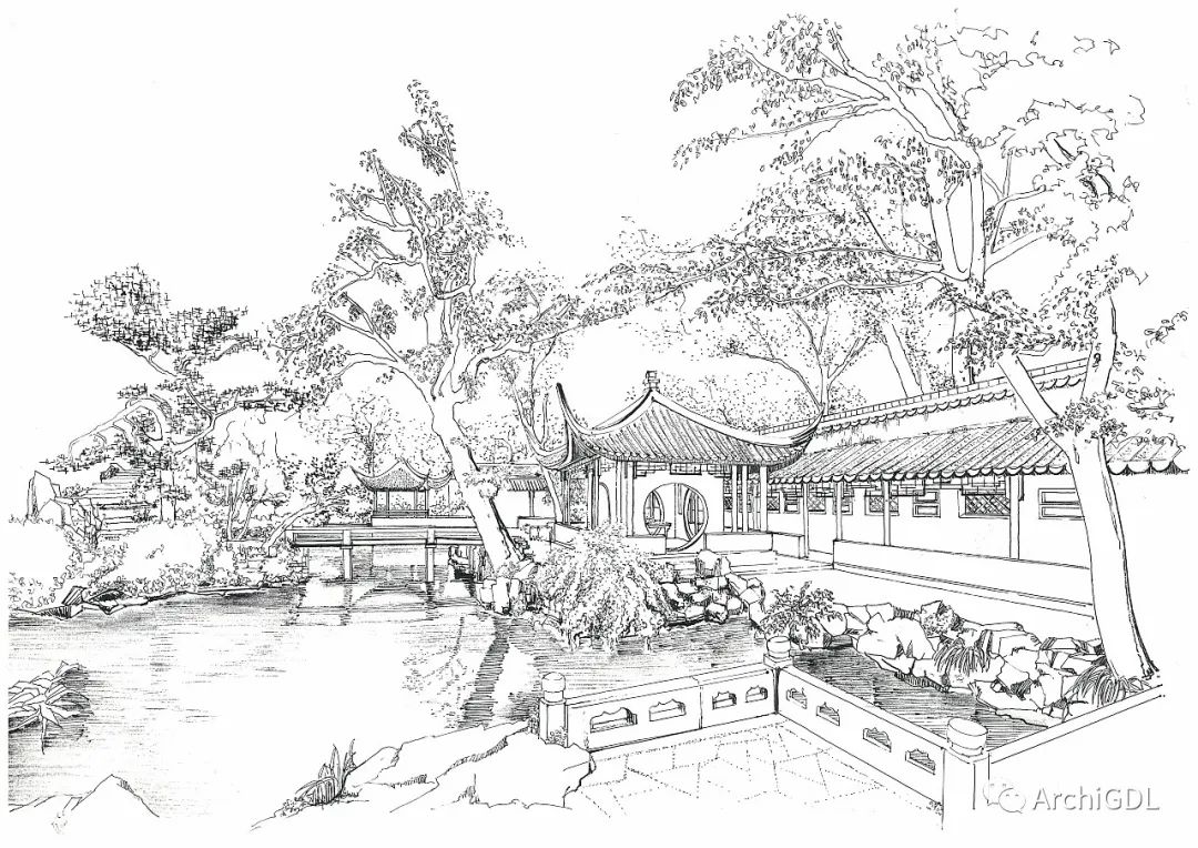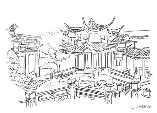 为了想验证,复杂的园林景观表达,是否也能表现出来。在网上找到一张画得很精美的钢笔画速写: