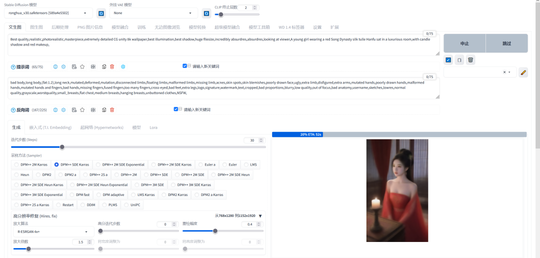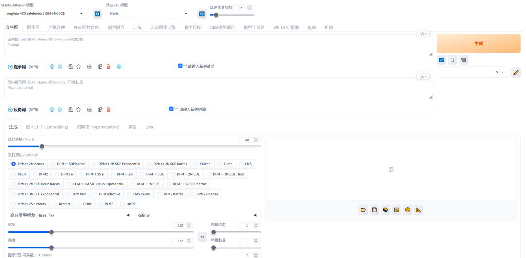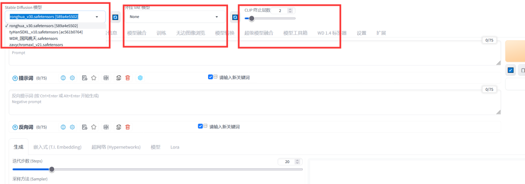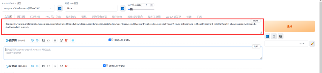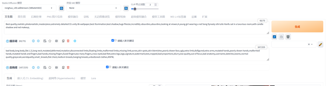 1、开始作画之前呢 我们要先选自己喜欢的大模型,和VAE、CLIP 终止层数。选了大模型后等他读秒结束再开始操作其他的;如果你用的Stable Diffusion普通版本要选VAE,这里一般选择vae-ft-mse-840000-ema-pruned.safetensors这个,如果是Stable Diffusion XL 那就不用选VAE,这里使用的是Stable Diffusion XL 作为演示;后面CLIP 终止层数绝大多数都是填2。这里选择ronghua_v30大模型为例: