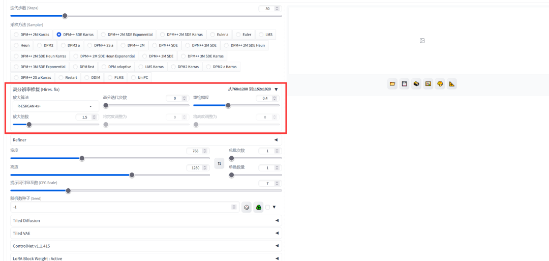 3、填写迭代步数 (Steps)这里如果大模型作者没说基本就是30步,采样方法 (Sampler)大模型作者没说的话就用DPM++ SDE Karras 这个好画人像,宽度填768 高度填1024或者1280,提示词引导系数 (CFG Scale)作者没说的话直接用7,默认数,随机数种子 (Seed)直接随机默认,不要动,全部填好后如下,没说的就默认度不动!!!