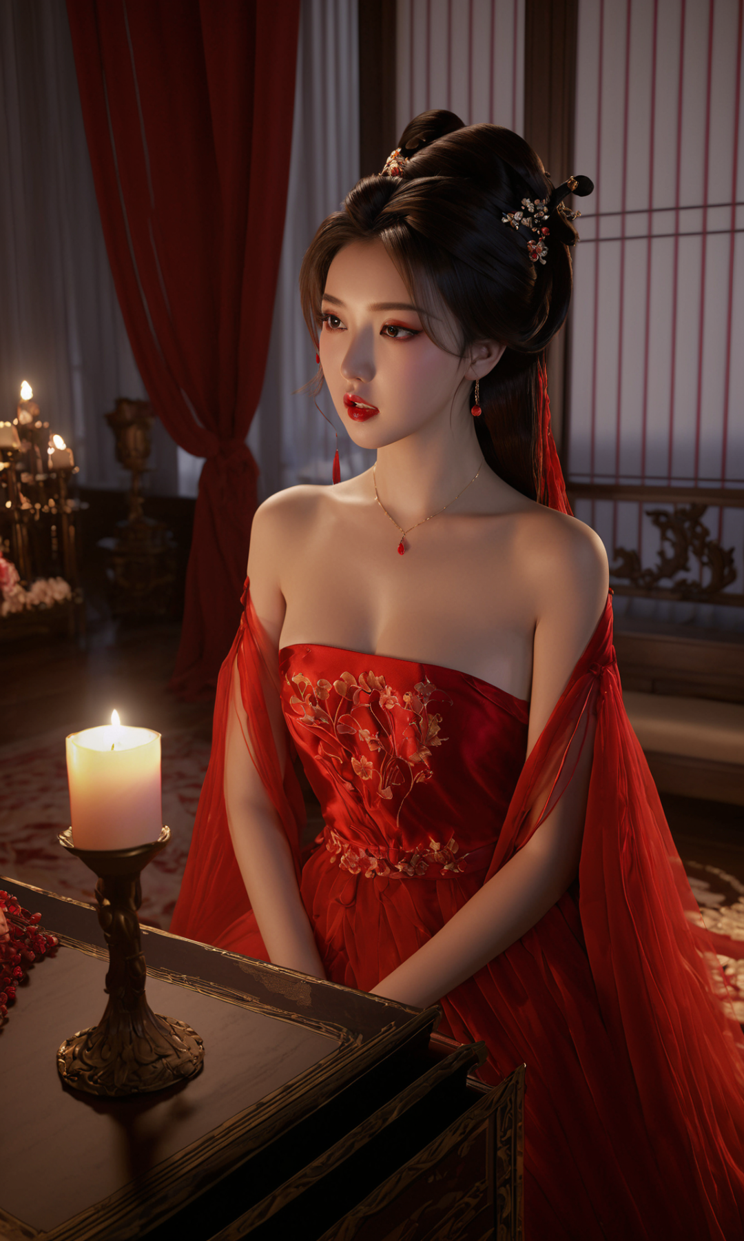 A young girl wearing a red Song Dynasty silk tulle Hanfu sat in a luxurious room, with candle shadow and red makeup