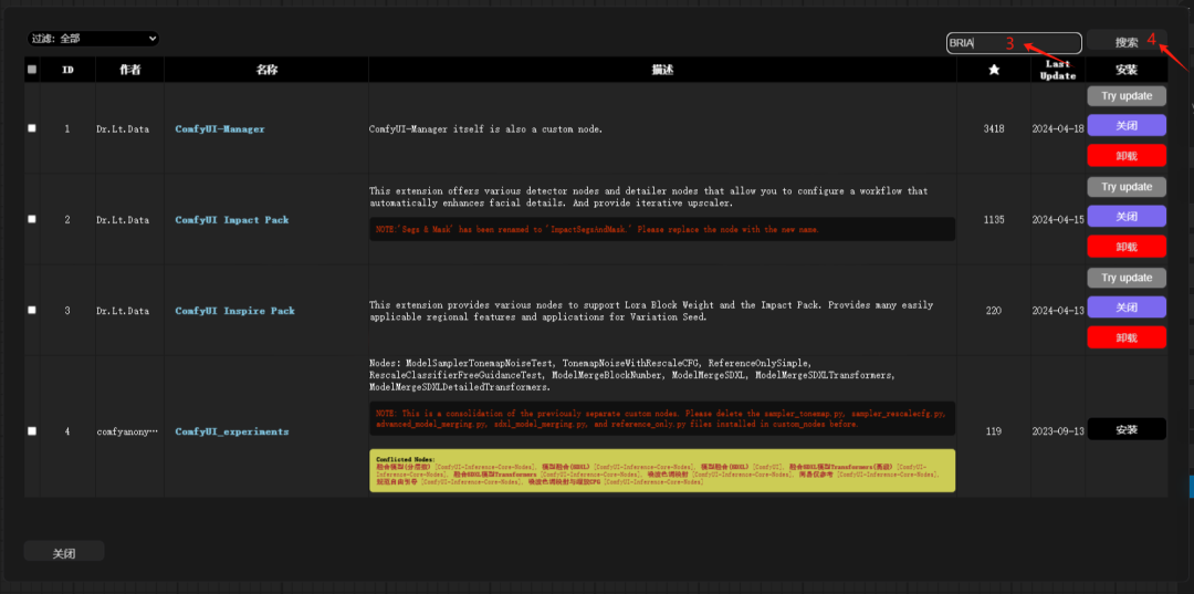 首先要进行BRIA和WAS Node Suite这两款扩展插件的一个安装,comfyui当中咱们常用的安装扩展插件的方式有三种: