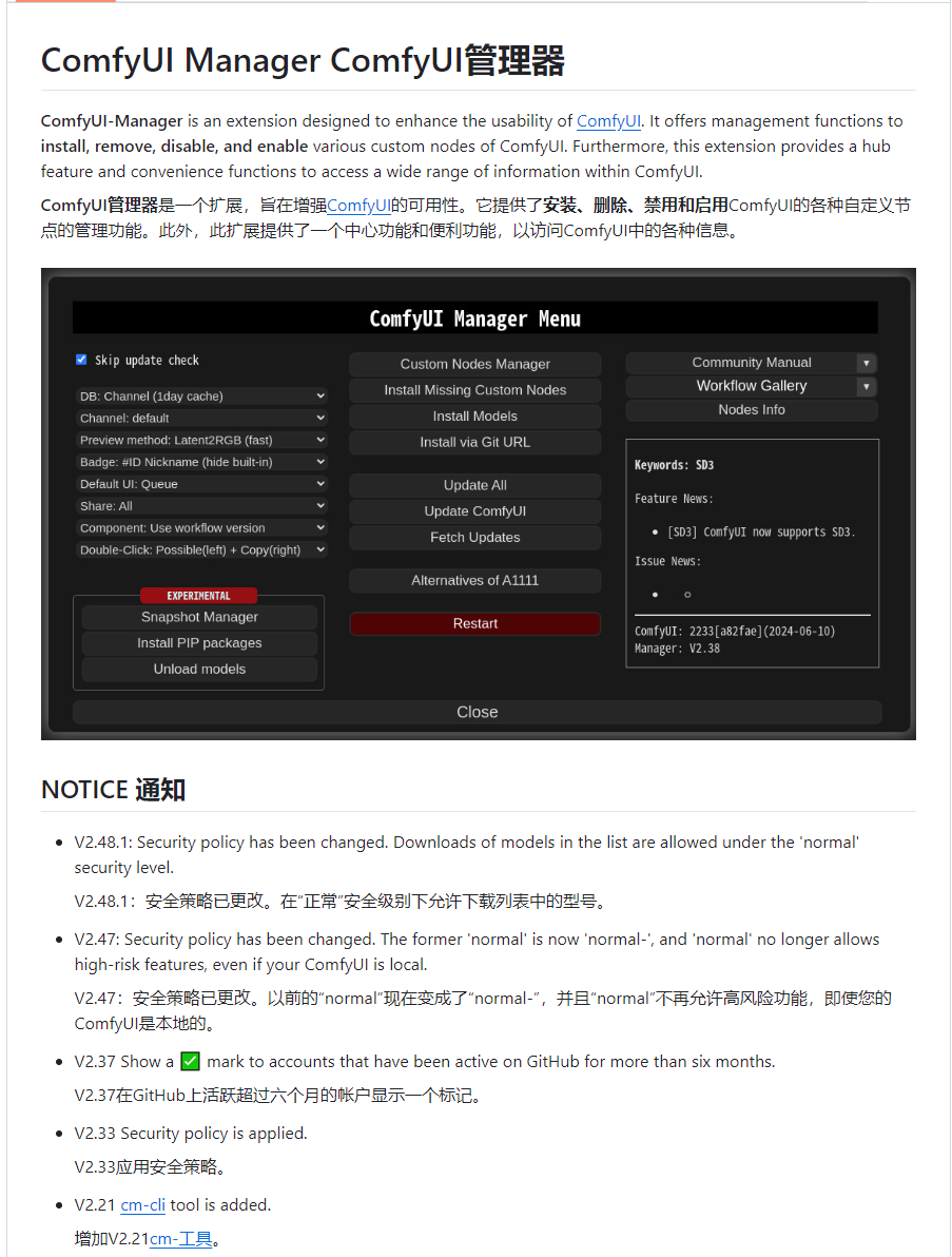 如上图中第4个插件ltdrdata/ComfyUI-Manager,见名知意,这个插件是ComfyUI管理器。点击会进入到这个插件的主页面。一般这个页面就是插件的gitlib官网首页。