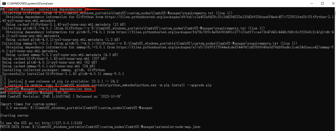 在ComfyUI启动控制台中,我们可以看到ComfyUI-Manager插件会自动安装依赖。