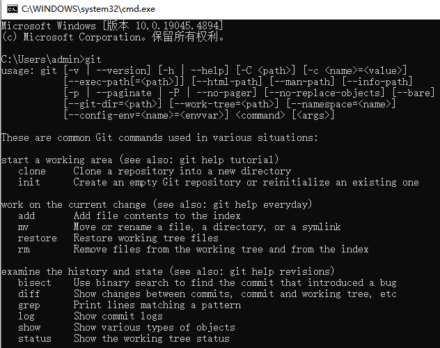 打开命令提示行窗口,输入git命令,出现如下图的所示内容表示git安装成功。