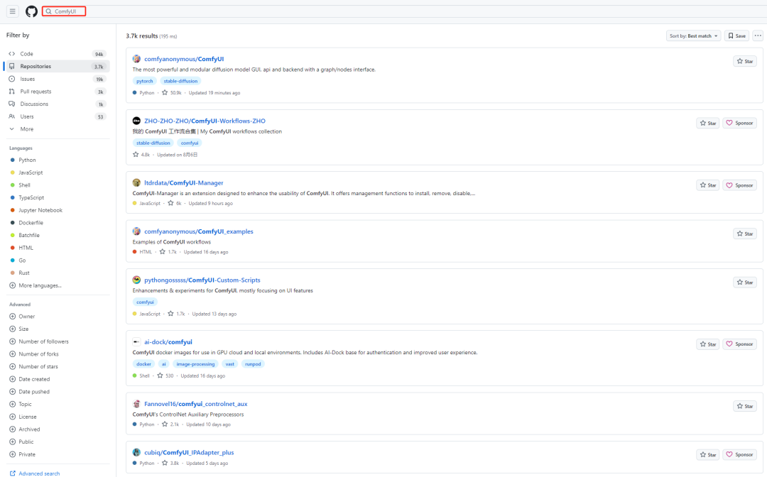 **【第二步】:**在搜索框输入关键词“ComfyUI”,查询出来的插件基本都是和ComfyUI相关的。