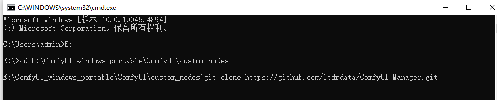 在\ComfyUI\custom_nodes目录下打开命令提示行窗口。使用如下命令