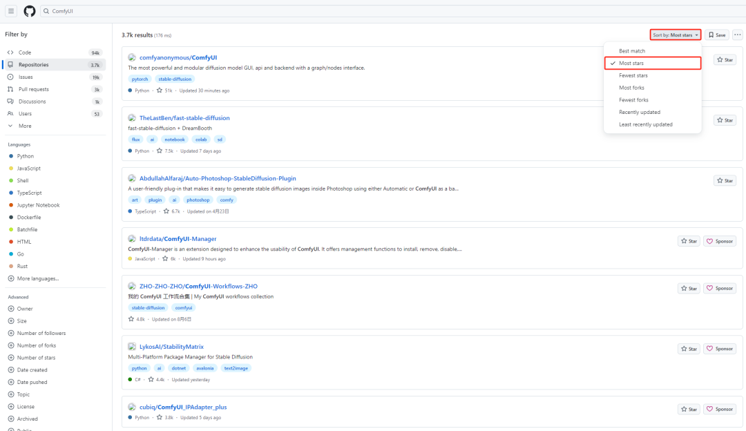 我们也可以通过github的排序功能对搜索的结果进行排序,例如下面我选择Most stars(最多星星,表示用户收藏最多)的排序。