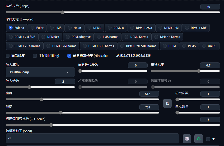 •尺寸 指定图像的长宽。出图尺寸太宽时,图中可能会出现多个主体。1024 之上的尺寸可能会出现不理想的结果,推荐使用小尺寸分辨率+高清修复(Hires fix)。