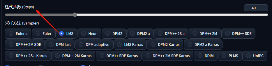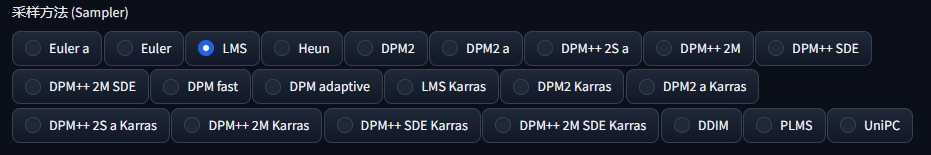 •Sampler(采样器/采样方法) 选择使用哪种采样器。Euler a(Eular ancestral)可以以较少的步数产生很大的多样性,不同的步数可能有不同的结果。而非 ancestral 采样器都会产生基本相同的图像。DPM 相关的采样器通常具有不错的效果,但耗时也会相应增加。
