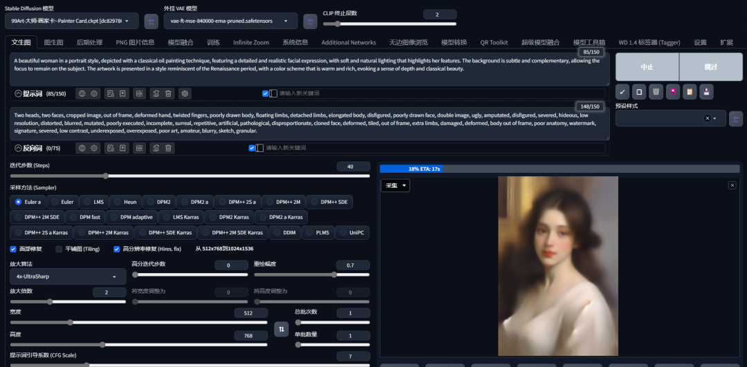 通过勾选 “Hires. fix” 来启用。默认情况下,文生图在高分辨率下会生成非常混沌的图像。如果使用高清修复,会型首先按照指定的尺寸生成一张图片,然后通过放大算法将图片分辨率扩大,以实现高清大图效果。最终尺寸为(原分辨率*缩放系数 Upscale by)。