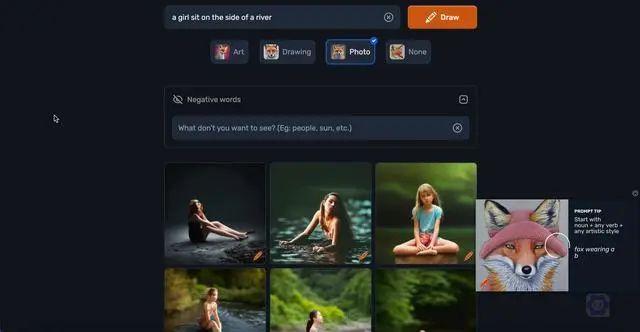 Craiyon,曾经被称为DALL·E mini,是一款令人惊叹的AI模型,能够根据你提供的任何文本提示创作出独特的图像!你只需要在输入框输入一些需要的关键字,稍等片刻就能生成出风格不同的图像.所长测试了下,效果还可以,但是人脸的细节有待提高,有兴趣的同学可以自己试试,目测可以免费试用。