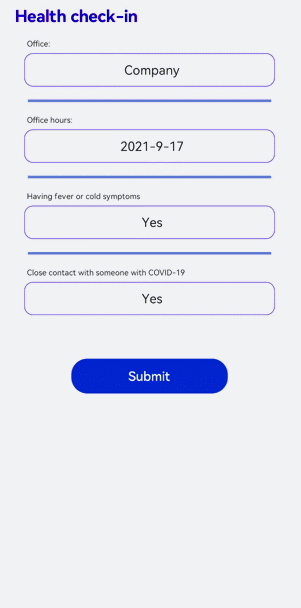 在本场景中,开发者可以自定义填写当前的健康情况来进行打卡。